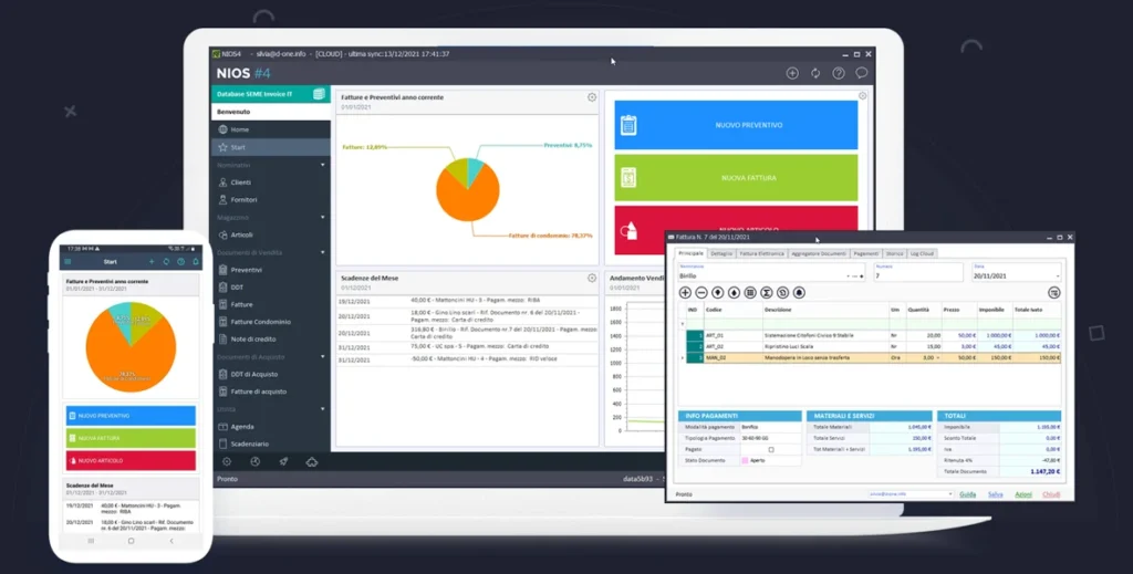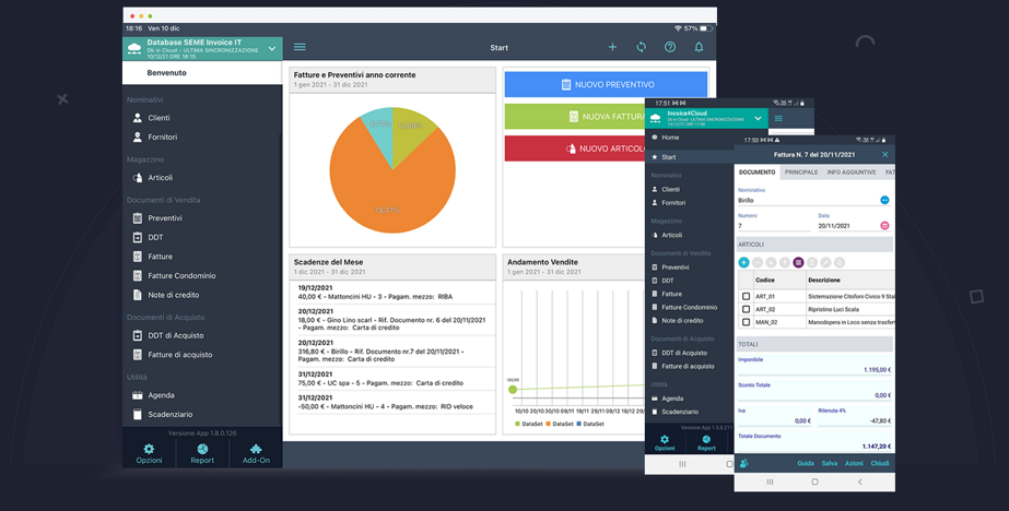 Risparmia il tuo tempo, facilita la gestione di fatture e pagamenti, lavora ovunque tu sia, online e offline senza internet da computer, smartphone e tablet. Fatturazione immediata sul posto presso il Cliente.